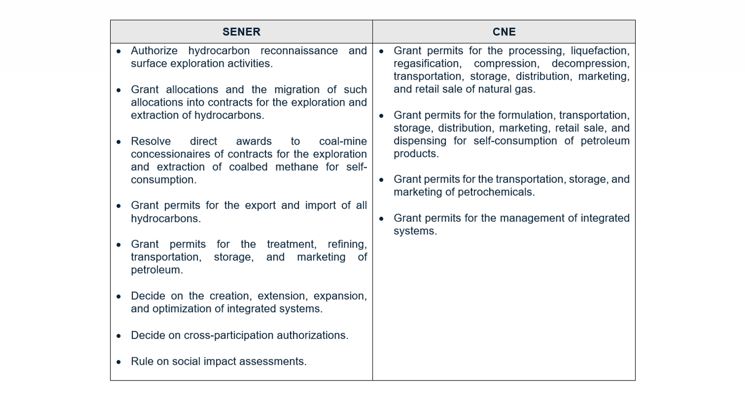 - Pursuant to the redistribution of powers following the dissolution of the Comisión Reguladora de Energía (Energy Regulatory Commission; “CRE”) and the Comisión Nacional de Hidrocarburos (National Hydrocarbons Commission; “CNH”), SENER will now be responsible for managing and overseeing authorizations, assignments, and contracts for hydrocarbons exploration and production.