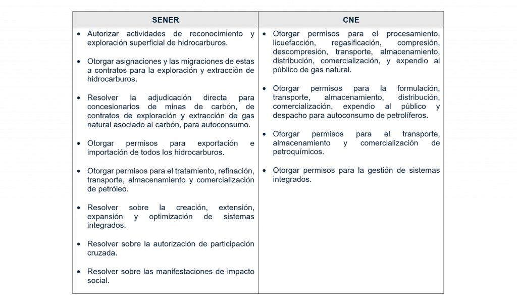 • Reguladora de Energía (“CRE”) y la Comisión Nacional de Hidrocarburos (“CNH”), ahora le corresponderá a SENER la gestión y control de autorizaciones, asignaciones y contratos para la exploración y extracción de hidrocarburos.